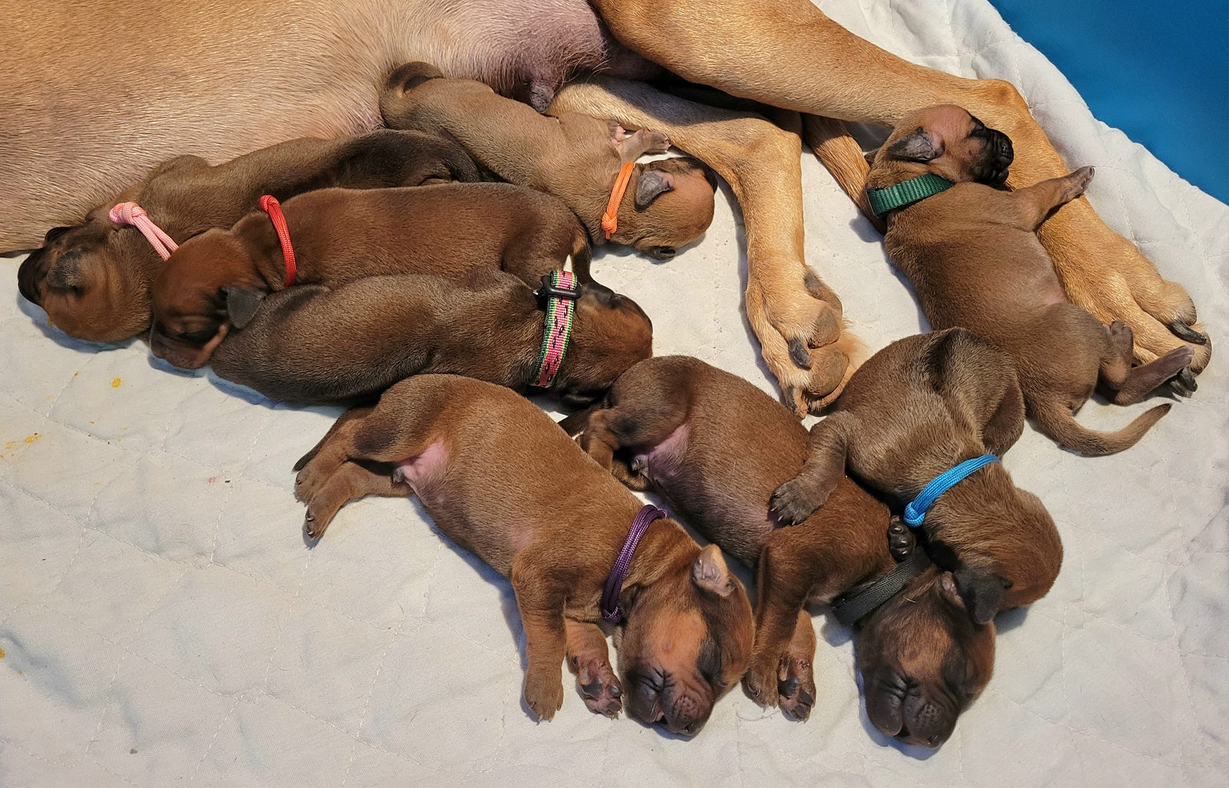 AUGUST 21, 2024 Haley whelped 8 puppies - 5 boys and 3 girls. All of the girls are spoken for but we have a few boys still available to the right home. Contact us for details.
