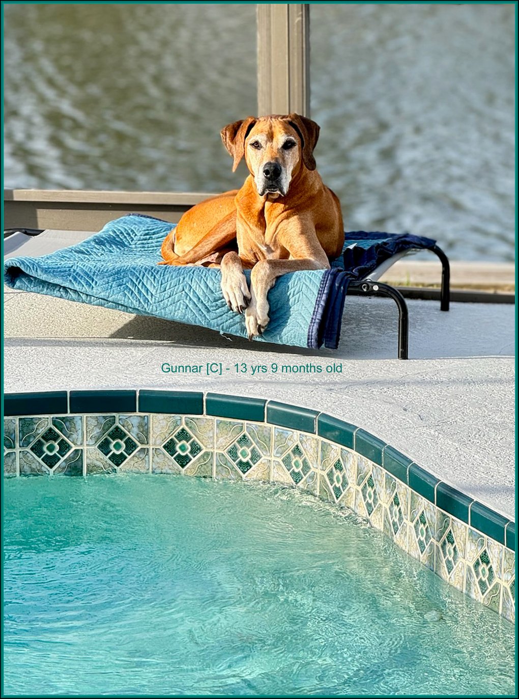 The sire, Gunnar was selected for his temperament and longevity genes. Gunnar turns 14 years old (ancient in Ridgeback years) on Sept. 8, 2024. His dam, Stella lived to be over 15 years. Both parents have passed extensive health and DNA testing. Reports are available for viewing on the OFA.org website. Gunnar and Haley are AKC registered and titled.