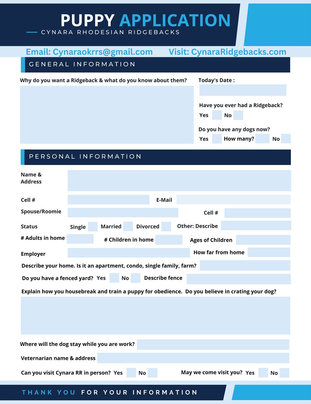 Cynara purchased our first registered Ridgeback in 2001. We waited 7 years before breeding our first litter (Litter A) in 2008. We breed once a year, sometimes longer. We don't breed very often because it allows us time to find the best owners. Cynara maintains an application list for people with patience who are willing to wait for one of our stellar puppies. We prefer puppy owners stay in close contact and encourage them to send us photos and updates on their dog. There is a private FB group set up for Cynara owners to ask questions and share idea, brags and warnings. Ridgebacks aren't the perfect dog for everyone so I urge people who've never owned a Ridgeback to do lots of research on the breed including visiting a couple of breeders to get an idea of what to expect.